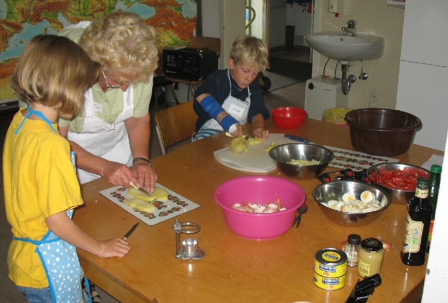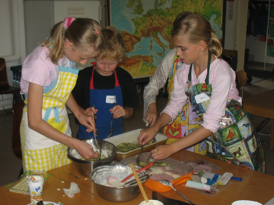 So lang mussten die Ferienspaß-Teilnehmer nicht aufs Essen warten, denn gleich nach der kurzen mündlichen Einführung in Sachen Land und Leute machten sich die kleinen und großen Köche tatkräftig an die Arbeit. Wie in einem Restaurant teilten sie die Gänge in Gruppen ein: Steffen, Philipp und ein weiterer Junge waren für den Salat zum Hauptgericht verantwortlich, Alina und ihre Freunde schnitten Paprika für das Paprikahuhn, Eileen und Franzi kümmerten sich um den Teig für das Dessert.