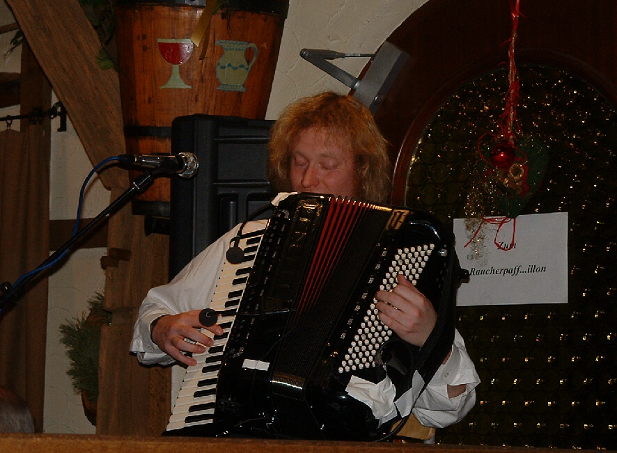 Während die Gäste ihre Fingerfertigkeit im Umgang mit dem Besteck bewiesen, zeigte Tobias Escher (ohne alias), welche Klänge ein Meister seines Fachs dem Akkordeon entlocken kann. Hätten nicht einige Gäste die Kleinkunst klein- und ihre privaten Gespräche großgeschrieben, wäre der Genuss vollkommen gewesen. Der Rest des Publikums lauschte jedoch aufmerksam dem virtuosen und variantenreichen Tastenspiel. Auch gesangstechnisch gefiel der Musiker, denn er beeindruckte nicht nur mit schnellen Fingern, sondern auch mit flinker Zunge. Es gab viel Beifall für seinen Auftritt und das üppige Repertoire, das von Polkas über Jazz bis zu südamerikanischen Impressionen reichte.