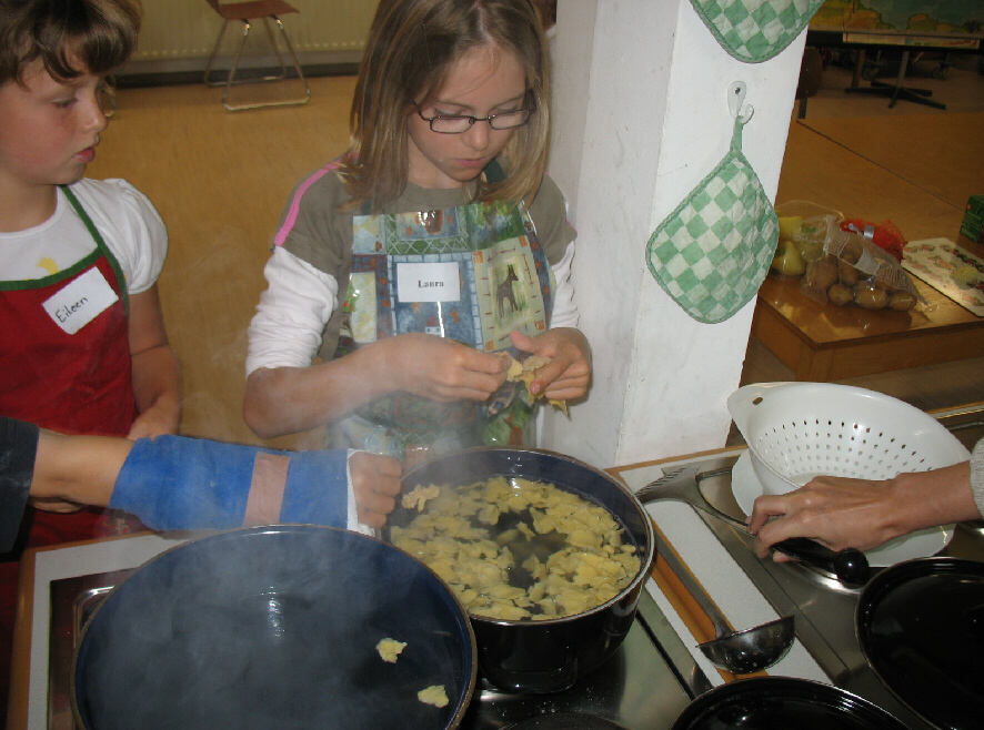 Zwölf Mädchen und Jungen kamen gestern zum ungarischen Kochkurs mit erfahrenen Köchinnen und Köchen, zum Teil echten Ungarn, in die Küche der Schillerschule. Bevor sich die Gourmets an die Zubereitung des Zwei-Gänge-Menüs machten - Paprikahuhn mit Nudelfleckerln und Hexenkugeln mit Zwetschgen - erklärte Hannelore Pentzlin vom Städtepartnerschaftsverein den Kindern zunächst einmal, in welche kulinarische Gegend sie sich begeben. Auf der großen Schullandkarte suchten und fanden sie die Fellbacher Partnerstadt, und Ignaz Halasz erzählte, dass die Autofahrt nach Pécs an die zwölf Stunden dauere.