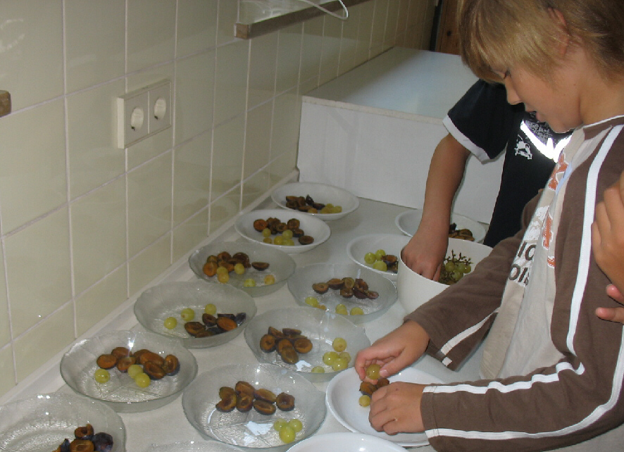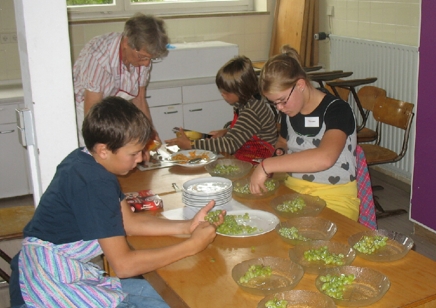 So lang mussten die Ferienspaß-Teilnehmer nicht aufs Essen warten, denn gleich nach der kurzen mündlichen Einführung in Sachen Land und Leute machten sich die kleinen und großen Köche tatkräftig an die Arbeit. Wie in einem Restaurant teilten sie die Gänge in Gruppen ein: Steffen, Philipp und ein weiterer Junge waren für den Salat zum Hauptgericht verantwortlich, Alina und ihre Freunde schnitten Paprika für das Paprikahuhn, Eileen und Franzi kümmerten sich um den Teig für das Dessert.