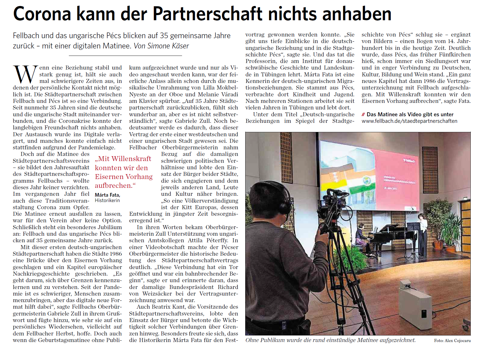 Über die Aufnahme berichtete die Fellbacher Zeitung am 1. April 2021.