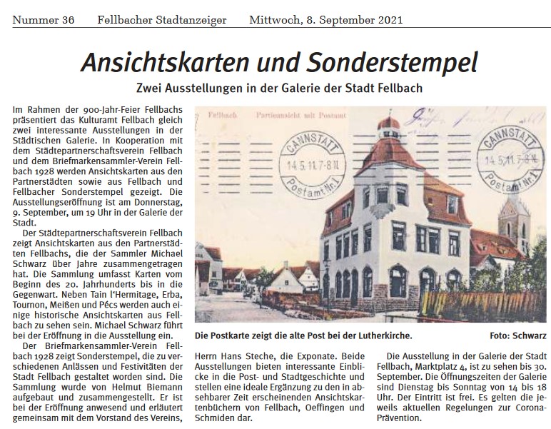 Der Fellbacher Stadtanzeiger kündigte diese Ausstellung am 8.9.2021 an unter dem Titel "Ansichtskarten und Sonderstempel".